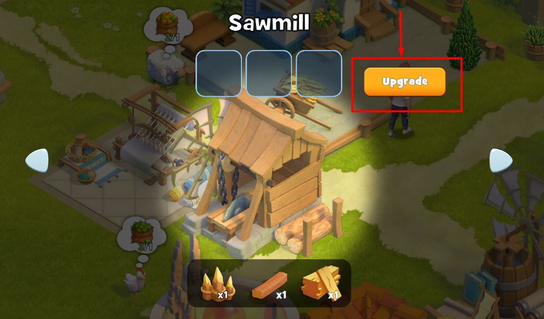 Du kannst die meisten Gebäude im Dorf weiterentwickeln und verbessern. Tippe dazu das gewünschte Gebäude an und dann im eingeblendeten Fenster auf „Verbessern“ (neben den Produktionsplätzen).