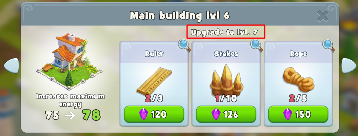 Manchmal musst du erst eine höhere Stufe erreichen, bevor du ein Gebäude verbessern kannst.