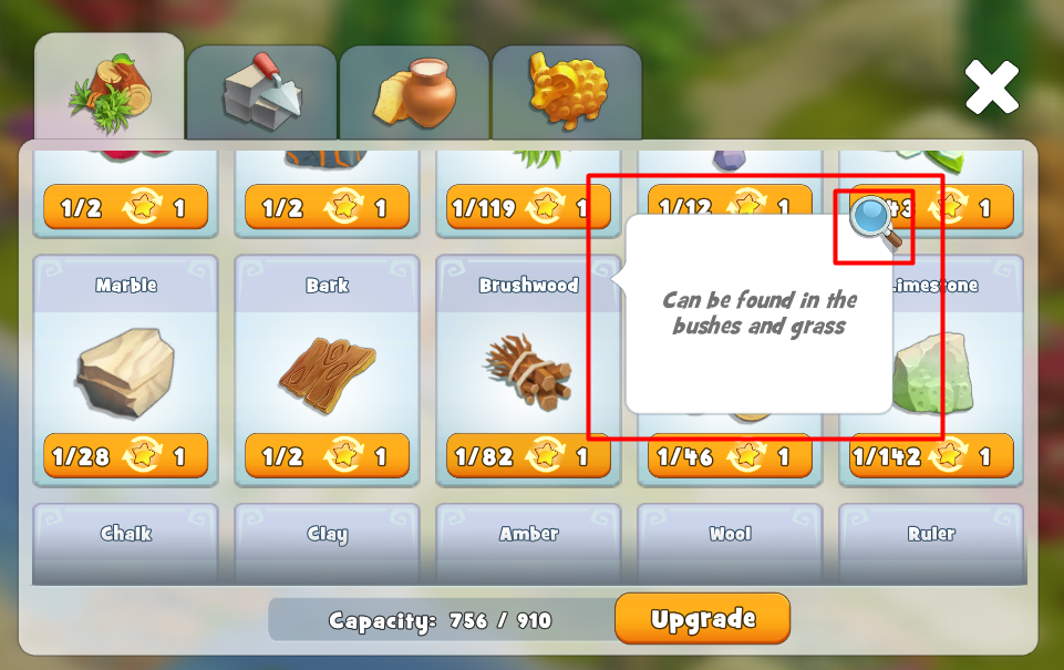 Neue Ressourcen findest du immer im Dorf und auf den anderen Inseln, wenn du Gegenstände wie Kalksteinvorkommen, Bäume, Büsche usw. entfernst. Wenn du wissen willst, wo du eine benötigte Ressource findest, öffne einfach das Lager und tippe auf ihr Symbol. Dann siehst du, wo du diese Ressource bekommen kannst. Du kannst auch die Lupe rechts oben antippen, um die nächstgelegene Quelle deiner gesuchten Ressource zu sehen.
