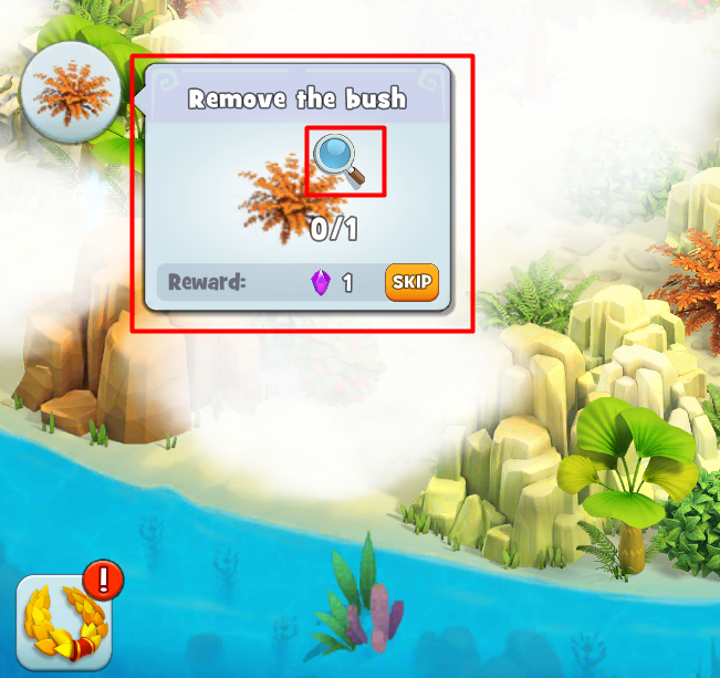 Links im Bildschirm siehst du eine Liste deiner Aufgaben. Um einen gesuchten Gegenstand für eine Mission zu finden, tippe auf das Aufgabensymbol und auf die Lupe neben dem Symbol des Gegenstands.