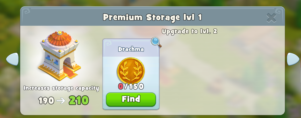 Wenn du aktiv Ressourcen sammelst und dein Lager zu klein ist, kannst du es mit zusätzlichen Funktionen im Spiel erweitern. Auf Stufe 8 bekommst du für das Erledigen einer besonderen Aufgabe kostenlos ein spezielles Premium-Lager. Die restlichen Premium-Lager können im Spiel gekauft werden. Du kannst dein Premium-Lager auch für Drachmen auf die Höchststufe 10 verbessern.